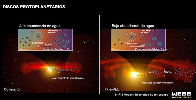 En general existen dos tipos de discos protoplanetarios, los llamados compactos y los extendidos. El telescopio espacial JWST acaba de desvelar los procesos de transporte de agua y volátiles en el interior de los discos protoplanetarios.