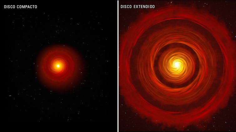 Las estrellas recién nacidas suelen pasar por un estadio juvenil en el que la intensa radiación que emiten barre el entorno gaseoso a partir del que se forman por el colapso gravitatorio de una nebulosa. Al desaparecer el gas nebular, la temperatura en los alrededores de las estrella decrece lo suficiente para permitir que pequeños minerales, hielos y materia orgánica se condensen. Esos materiales chocan y forman agregados que se acumulan alrededor de las estrellas jóvenes, formando los llamados discos protoplanetarios.